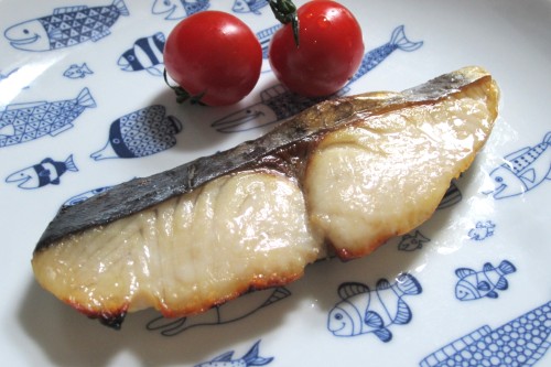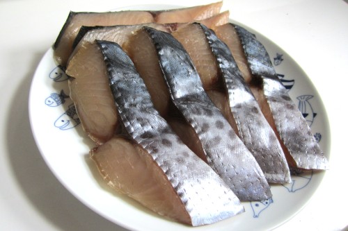 サワラの切身が売っていたので買って帰りました。以前にサワラの切り身を干してみたらとても美味しかったので、また作りたいと思っていたのです。 麺つゆを少し入れた塩水に90分ほど浸けて、表面の水分を拭き取り、干し網に並べて干します。身が厚かったのでほぼ1日干しました。